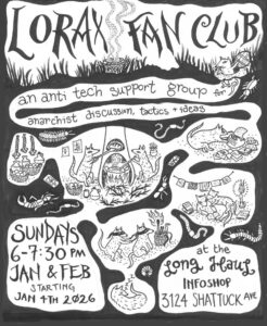 We are located at 3124 Shattuck Ave in south Berkeley — just 3 blocks east of Ashby BART. For 28+ years the infoshop has been welcoming the public to browse our library, hang out, have a sip of water or coffee, and meet new people. Come say hi!